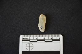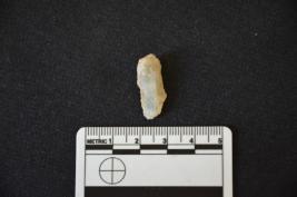 | Description / विवरण | Chalcedony utilized flake has a ridge on dorsal side, striking platform, chipped off bulb on ventral side and use-wear marks on both working edges. |