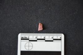 | Description / विवरण | A chalcedony heated utilized flake with bulb and use mark on one edge. |