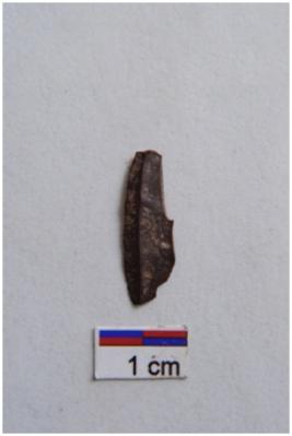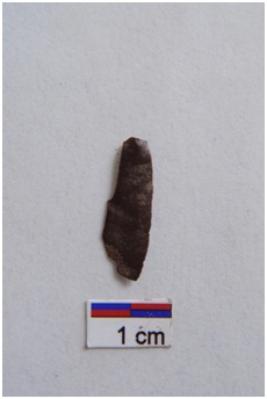 | Description / विवरण | Blade, prominent bulb with striking platform at proximal end, a ridge on dorsal surface, use-ware marks on both working edges. |