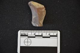 | Description / विवरण | A chert utilized flake has a mid ridge on dorsal side, striking platform, bulb on ventral side and use-wear marks on working edge. |