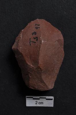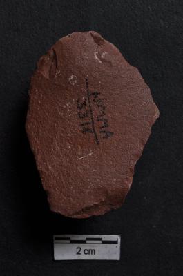 | Description / विवरण | Miniature Handaxe, pear shaped, made on pebble, cortex visible on surface, alternate flaking along the periphery. |