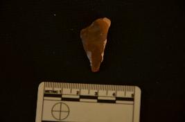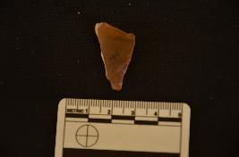 | Description / विवरण | Chert utilized flake has ridges and flake scars on dorsal side staking platform, diffused bulb on ventral side and use wear marks on working edge. |