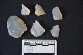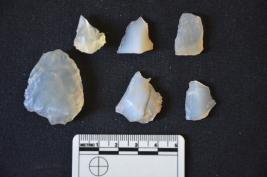 | Description / विवरण | Fragment of Moss Agate has two ridges on dorsal side, broken from both ends, use-wear marks on cutting edge and trapezoidal cross-section. |