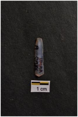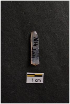 | Description / विवरण | Blade, parallel sided, prominent bulb with striking platform at proximal end, a ridge on dorsal surface, use-ware marks on both working edges. |