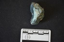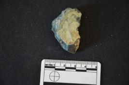 | Description / विवरण | A blood stone utilized flake has flake scars, striking platform and use wear marks on working edge. |