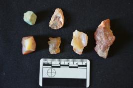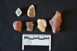 | Description / विवरण | Chalcedony blade fragment has two ridges on dorsal side, striking platform, broken from distal end, use-wear marks on cutting edges and trapezoidal cross-section. |