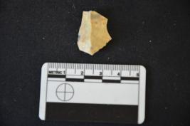| Description / विवरण | Chert utilized flake has a ridge on dorsal side, striking platform, bulb on ventral side, broken from distal end and use-wear marks on working edge. |