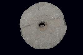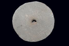 This is a sculpture of grinder stone or chakki made of sand stone and only shape is round. It may be used for Grinder the grain. Surface is rough and flaked. It has a stand.
