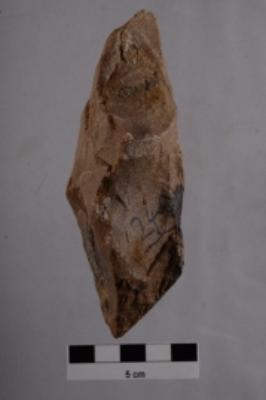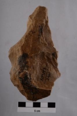 | Description / विवरण | Handaxe, bifacial, pointed distal end, alternate flaking along the periphery. |