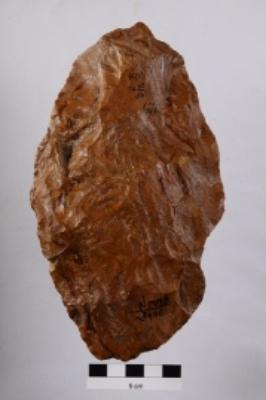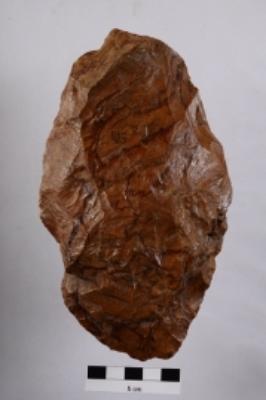 | Description / विवरण | Handaxe, oval shape, bifacial, retouches along the periphery. |