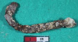 | Description / विवरण | A bended nail having incrusted and rough surface. |