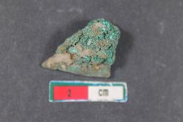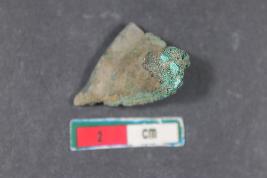 | Description / विवरण | Fragment of a entirely incrusted Arrow Head with bended corner having rough surface. |