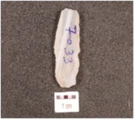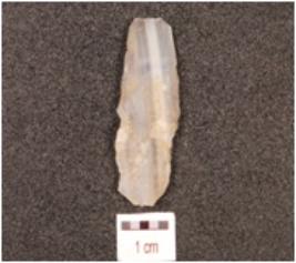 | Description / विवरण | A blade made on chalcedony, flake scars on the dorsal side, wavy cutting edges and smooth surface. |