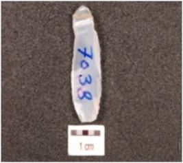 | Description / विवरण | A blade made on chalcedony, flake scars on the dorsal side, prominent bulb on the ventral side, prepared platform on the proximal end, use wear marks on the cutting edges and smooth surface. |