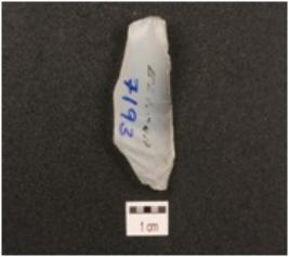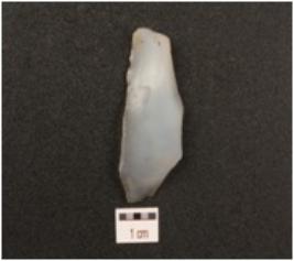 | Description / विवरण | An utilized flake with a prepared platform, bulb on the ventral side, use wear marks at cutting edge, flat end section. |