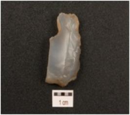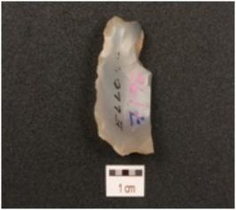 | Description / विवरण | A blade made on chalcedony with a single ridge, bulb on the ventral side, broken at distal end, irregular retouches at the cutting edge and trapezoidal in section. |