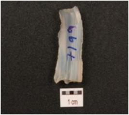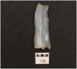| Description / विवरण | A blade on chalcedony with a prominent ridge, broken at both ends, use wear marks on the cutting edge and trapezoidal in shape. |