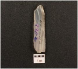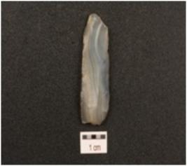 | Description / विवरण | A blade made on chalcedony with double ridge, diffused bulb on the ventral side, use wear marks at the cutting edge and trapezoidal in section. |