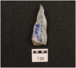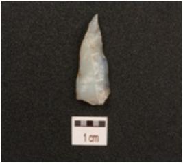 | Description / विवरण | A blade made on chalcedony with a single ridge, use wear marks on cutting edge, pointed at distal end, broken along proximal end and triangular in section. |