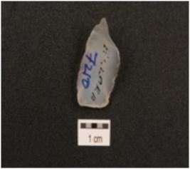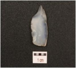 | Description / विवरण | A blade on chalcedony with a prominent ridge, diffused bulb on the ventral side, use wear marks at cutting edge, pointed on the distal end and trapezoidal in section. |
