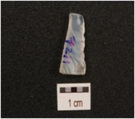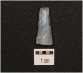 | Description / विवरण | A blade made on chalcedony with a single ridge, diffused bulb on ventral side, broken on the distal end, irregular retouches on the cutting edge and trapezoidal in section. |