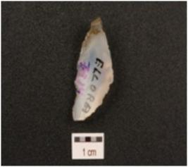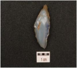 | Description / विवरण | A blade made on chalcedony with a prominent ridge, irregular retouches at cutting edge and triangular in section. |