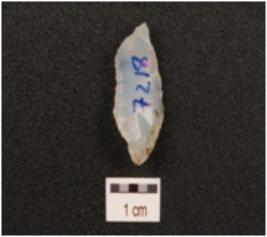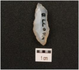 | Description / विवरण | A blade made on chalcedony with a single ridge, chipped off bulb, use wear marks on the cutting edges and triangular in section. |