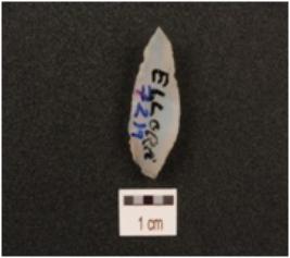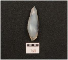 | Description / विवरण | A blade made on chalcedony with double ridge, diffused bulb on ventral side, pointed at distal end, use wear marks on the cutting edge. |