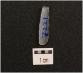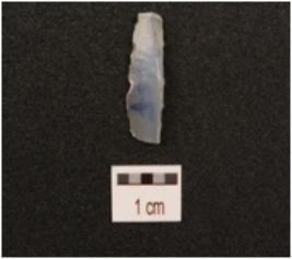| Description / विवरण | A blade made on chalcedony with a prominent ridge, broken at both ends, use wear marks at the cutting edge and triangular in section. |