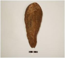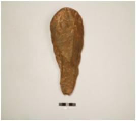 | Description / विवरण | Handaxe made of quartzite pebble, flake scars on both sides, cortex on posterior butt end, pointed an anterior sharp cutting edge, biconvex in section. |