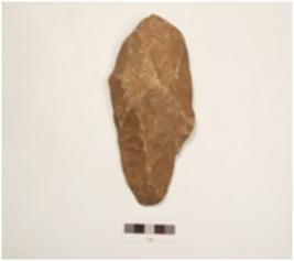 | Description / विवरण | Handaxe made an end struck quartzite flake, prepared platform, flake scars on both sides, sharp cutting edge. |