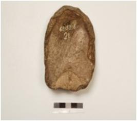 | Description / विवरण | Scraper made of side struck quartzite flake, prepared platform, prominent bulb on ventral side, flake scars on both sides. |