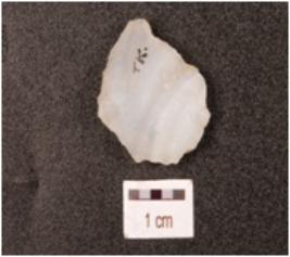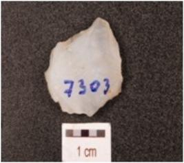 | Description / विवरण | An end struck utilized flake, made on chalcedony, prepared platform, prominent bulb on ventral side and use-wear marks along the sharp edges. |