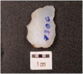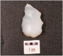 | Description / विवरण | A side struck utilized flake made on chalcedony, prepared platform, prominent bulb on ventral side and use-wear marks along sharp edge. |