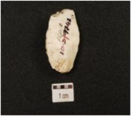 | Description / विवरण | A chert blunted blade with double ridge on dorsal, striking platform on proximal end, slightly chipped bulb on ventral, trapezoidal cross section and broken along distal end. |