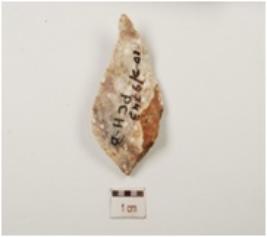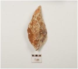 | Description / विवरण | A chert end struck utilized flake with flake scars on dorsal, prepared platform, bulb on ventral, triangular cross section, pointed along distal end and use wear marks on edges. |