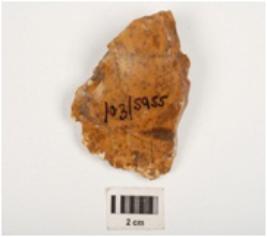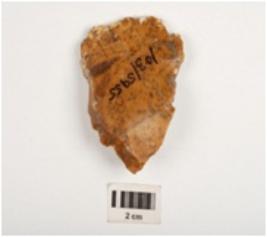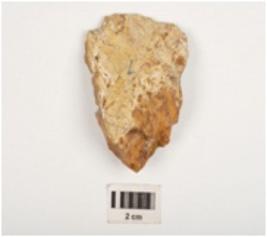 | Description / विवरण | A scraper made on chert with flake scrs on dorsal side, prominent bulb on ventral side, prepared platform, use wear marks on cutting edges. |