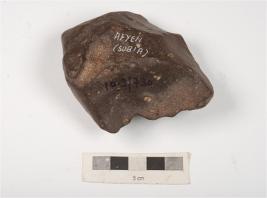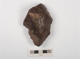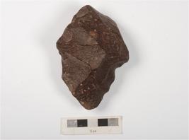 | Description / विवरण | A miniature handaxe made on basalt stone with prepared platform, flake scars and small pores on dorsal and ventral side, irregular retouches on working edge. |