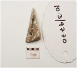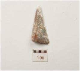 | Description / विवरण | A chert utilized flake with prominent mid ridge on dorsal, triangular cross section, use wear marks on edges and pointed along one end. |