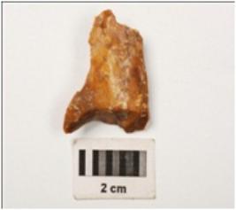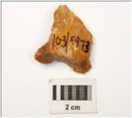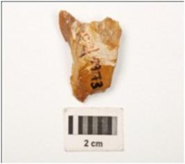 | Description / विवरण | A scraper made on chert, flake scars on dorsal side, prepared platform, use wear marks on cutting edges, smooth surface. |