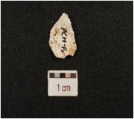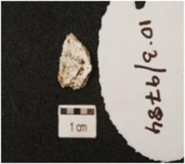 | Description / विवरण | A chert end struck utilized flake with striking platform, bulb on ventral and use wear marks on edges. |