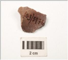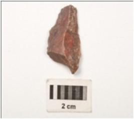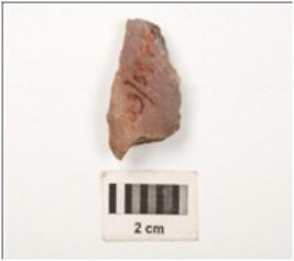 | Description / विवरण | A scraper made on chert with ridge on dorsal surface, prepared platform, diffused bulb on ventral side, use wear marks on cutting edges. |