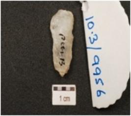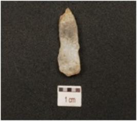 | Description / विवरण | A chalcedony blade, ridge on dorsal side and use wear marks on cutting edge. |