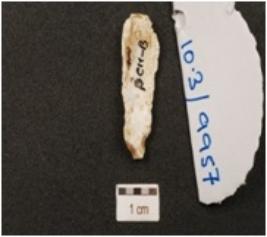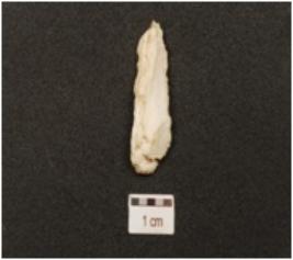 | Description / विवरण | A chalcedony blade, mid ridge on dorsal, prepared platform, bulb on ventral and use wear marks on cutting edges. |