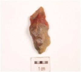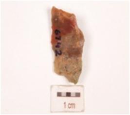 | Description / विवरण | A flake made of chert, irregular in shape, flake scars on surface, diffused bulb is missing, wavy cutting marks on edges. |
