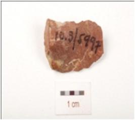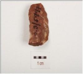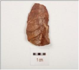 | Description / विवरण | Chert, double sided scraper on end struck flake with a mid ridge and a blade scar on dorsal side, diffused bulb on ventral side, prepared platform, use wear marks on cutting edges and triangular in section. |