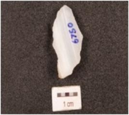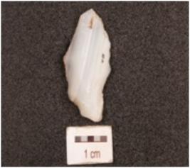 | Description / विवरण | A flake made of chalcedony, flake scars on dorsal side, diffused bulb on ventral side, irregular retouch marks on edges. |