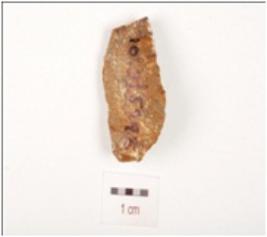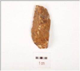 | Description / विवरण | Chert, side scraper with a prominent mid ridge on dorsal side, prepared platform, diffused bulb on ventral side, irregular retouches on one cutting edge and triangular in section. |