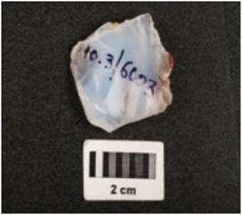 | Description / विवरण | Chalcedony end scraper on end struck flake, flake scars with ripple marks on dorsal side, chipped off bulb on ventral side and use wear marks on working edge. |