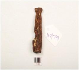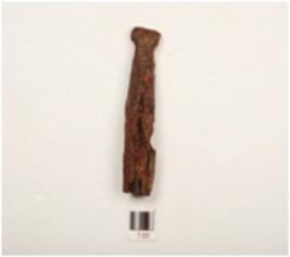 | Description / विवरण | Fragment of a iron nail rusted surface and chemically treated uneven shape, one end is pointed end is broad. |
